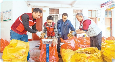 广西梧州蒙山县长坪瑶族乡长坪村驻村工作队队员与农户一起分装生姜。黄胜林摄