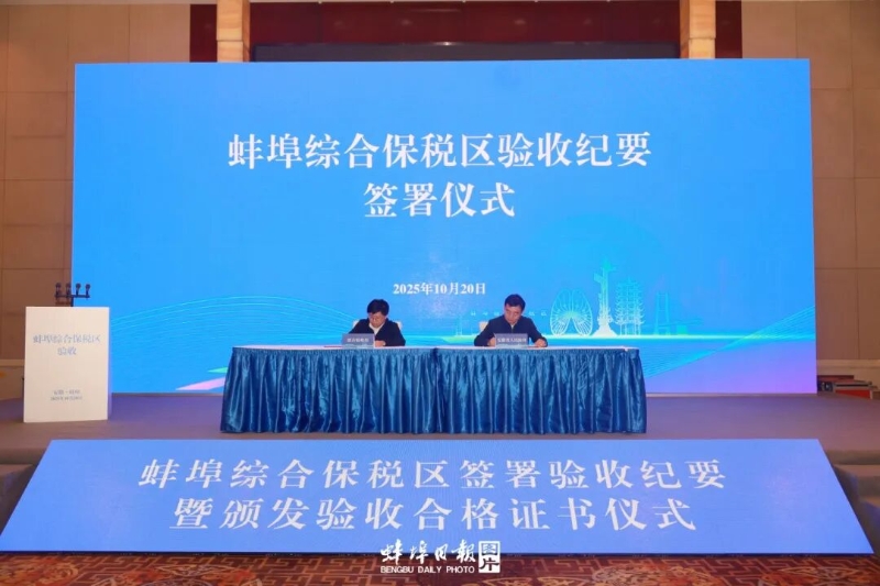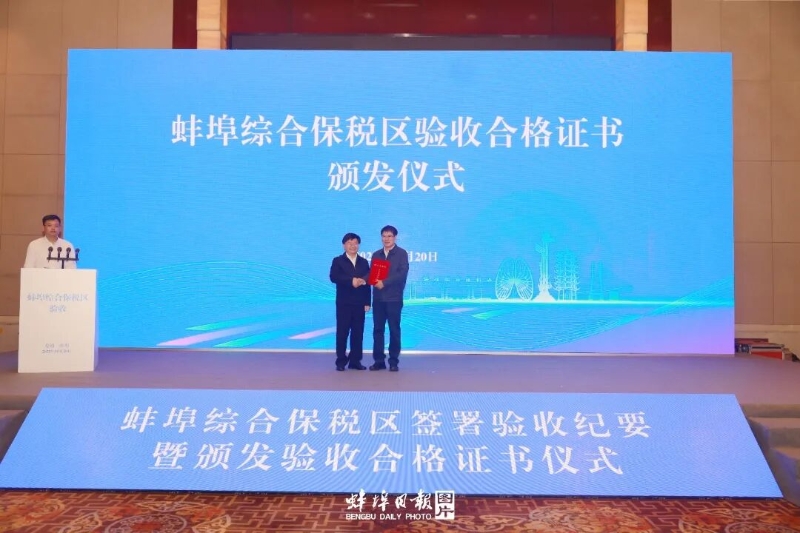 10月20日,蚌埠综合保税区验收纪要签署暨证书颁发仪式举行,标志着蚌埠综保区顺利通过正式验收,正式具备封关运行条件。联合验收组组长、海关总署自贸司司长潘城,省政府办公厅副主任方劲松,合肥海关副关长李燕出席仪式;市委书记、市长马军在活动中发言,市领导葛锐、吴永彬参加。