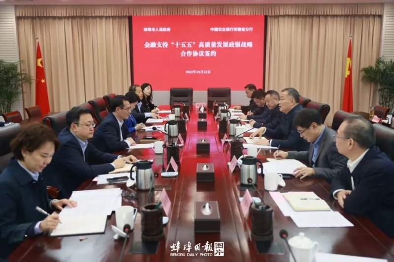 10月22日下午,市政府与中国农业银行安徽省分行签订金融支持“十五五”高质量发展政银战略合作协议。市委书记、市长马军出席签约活动,并与农行安徽省分行党委书记冯必凤举行工作座谈。市委常委、常务副市长葛锐,农行安徽省分行党委委员、副行长刘晓庆参加。